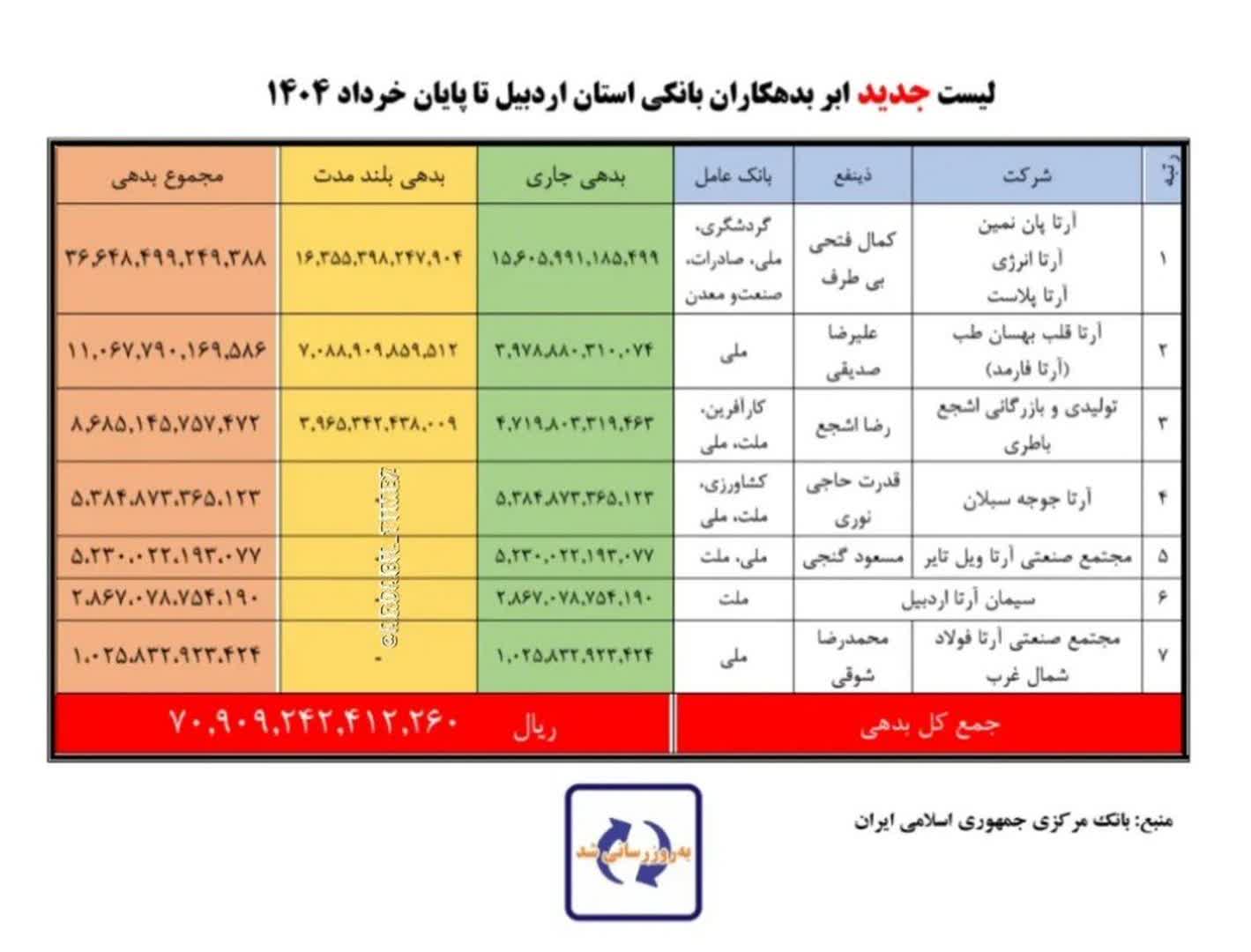 بانک مرکزی فهرست جدید ابربدهکاران نظام بانکی تا پایان تیرماه را منتشر کرد که در این میان نام ۷ ابربدهکاران استان اردبیل نیز به چشم می خورد.