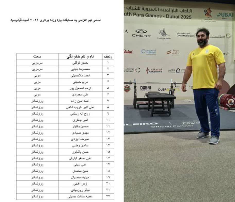 ترحیم اسمعیل پور از شهرستان پارس آبادمغان، به عنوان مربی تیم ملی پاراوزنه برداری کشورمان به این مسابقات اعزام می شود.